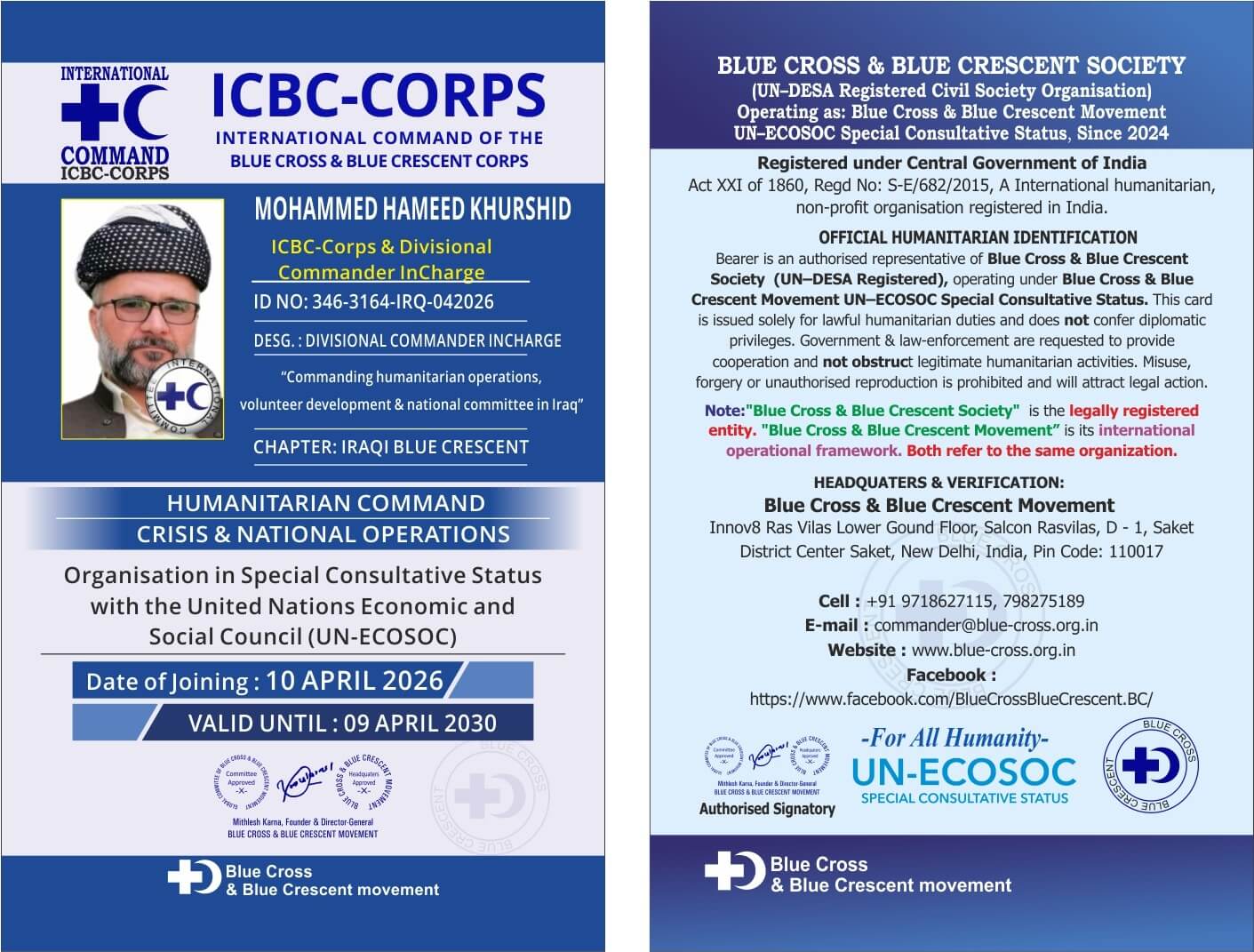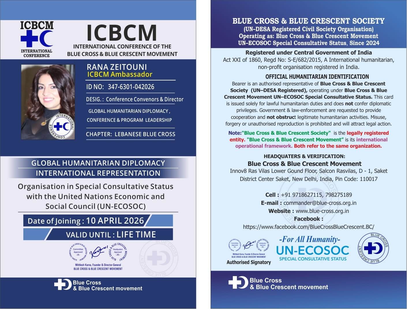 ICBCM AMBASSADOR & CONFERENCE CONVENORS IFBC – LEBANESE BLUE CROSS 🌍🚨 OFFICIAL INTERNATIONAL HUMANITARIAN APPOINTMENT ANNOUNCEMENT 🚨🌍 The Blue Cross & Blue Crescent Movement (UN–ECOSOC Special Consultative Status) is honoured to officially announce the appointment and operational authorisation of: 👤 RANA ZEITOUNI🎖️ ICBCM Ambassador📌 Designation: Conference Convenor & Director 🌐 Chapter: Lebanese Blue Cross 🌍 […]